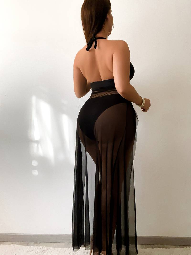 Ignite your confidence in the Black Ember Set — a sultry two-piece designed to captivate. Featuring a curve-hugging opaque bodysuit topped with a floor-length sheer mesh overlay, this piece blends bold structure with seductive flow. The halter neckline frames the bust, while the see-through skirt teases just enough. Perfect for the woman who owns every room she walks into.