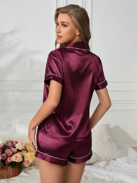 Slip into the sensation of Caressé — a satin pajama set designed to feel like a gentle touch on the skin. Featuring a classic button-down top with elegant piping and matching relaxed shorts, this set blends timeless comfort with modern femininity.